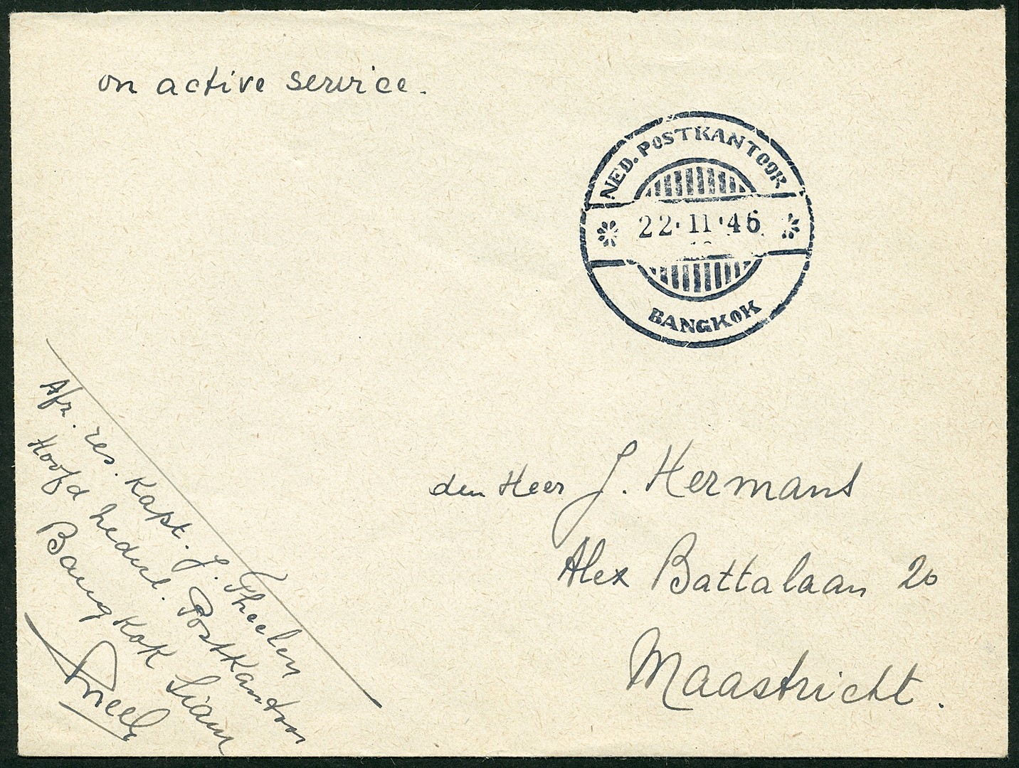 Superbe afdruk ´Ned. Postkantoor/Bangkok´ op env. (geen klep) van kapitein Theelen op 22-11-1946 naar Maastricht