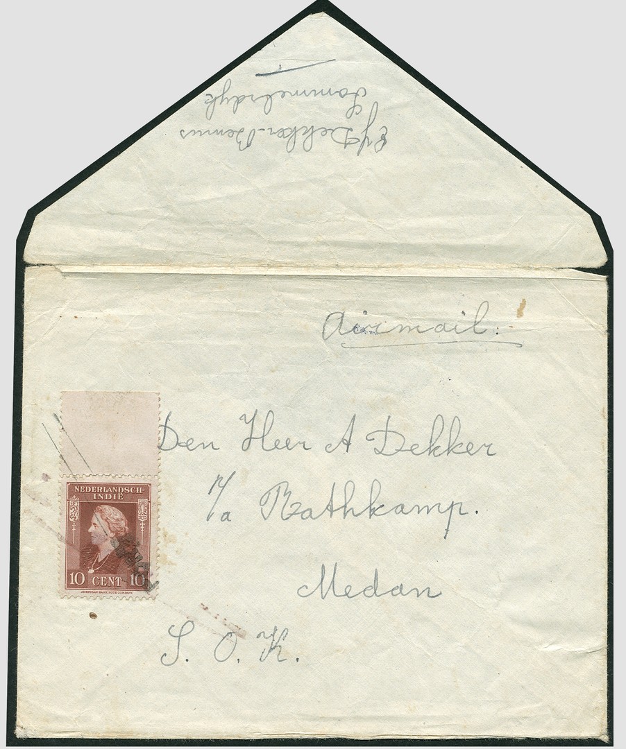 MEDAN NOODPORT. Envelop geschreven aan boord van het ms. ´Sommelsdijk´ (afzender: E.J. Dekker-Bemus, Sommelsdijk) op weg naar Nederland, vanuit Suez verzonden via Batavia naar Medan, en daar in mei 1946 voorzien van een zegel met velrand van 10 cent type ABC, afgestempeld met PORT. Dit is het ons tweede bekende poststuk waarop een Medan-portzegel, bovendien niet gericht aan de geestelijke vader ervan, P. Varekamp. Het andere poststuk is geveild in veiling 603, kavel 5166 (ex Mr Tj. de Jong). Opinie SvL: Deze brief is authentiek en door E.J. Dekker-Bemus gestuurd aan A. Dekker, werkzaam bij de firma Rathkamp, apothekers te Medan. Grote rariteit en tentoonstellingsstuk voor iedere belangrijke collectie postgeschiedenis Ned.- Indië