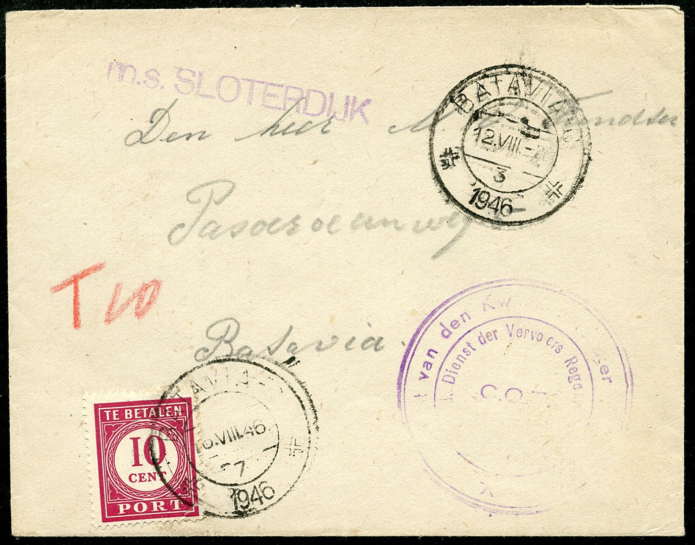 Ongefr. verz. env. a.b. ´m.s. SLOTERDIJK´ (p/a Marine evacuatiekamp Doorn) naar Batavia-C. 12-8-1946 daar op 16-8 beplakt met zeer fraai portzegel van 10 cent