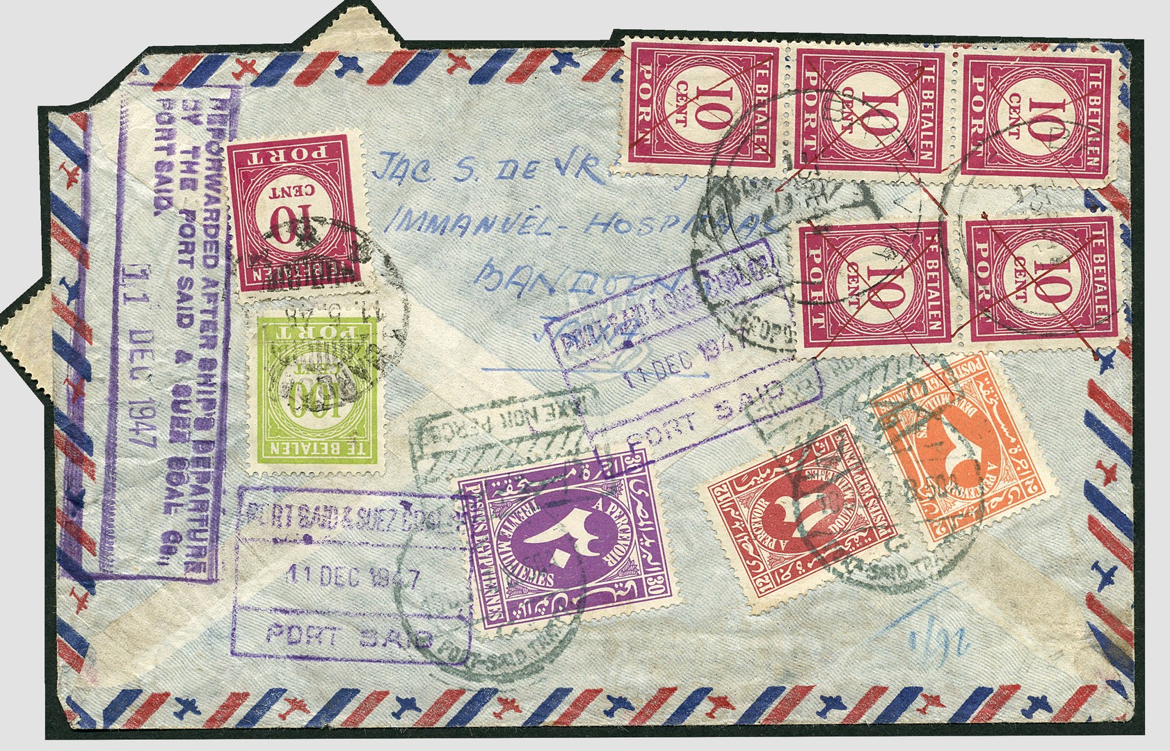 Luchtpostcouvert uit 1947 ongefr. van Bandoeng met bestemming een opvarende a/b ´Willem Ruys´ te Port Said. Talrijke omzwervingen en beportingen, veelal niet geïnd, zowel in Egypte als in Indië, met portzegels aan de vz. en az. beplakt. Interessante puzzel!