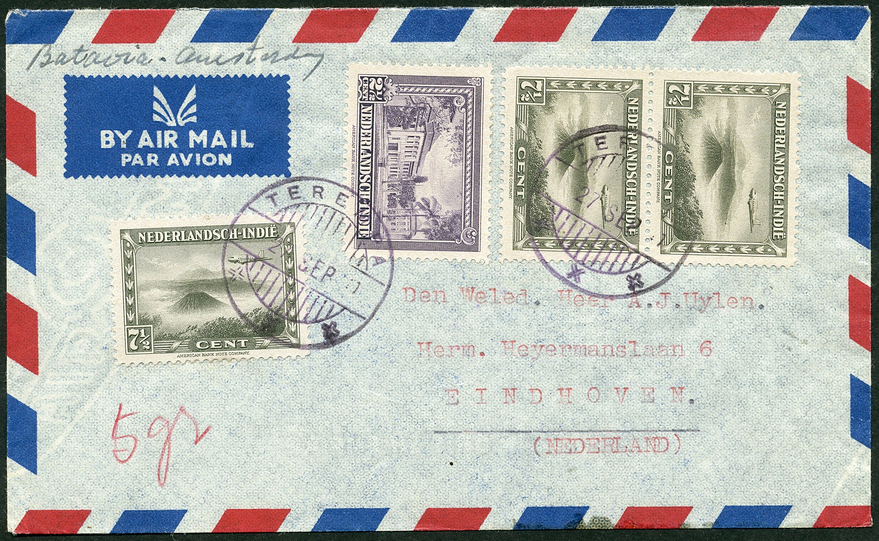 Luchtpostenvelop gefr. met 2½c en 3x 7½c ABC-zegels, in violet afgest. TEREMPA (Bu. type Z) op 27-9-1947 naar Nederland. Terempa is een zeer klein kantoor in de Riouw-Archipel