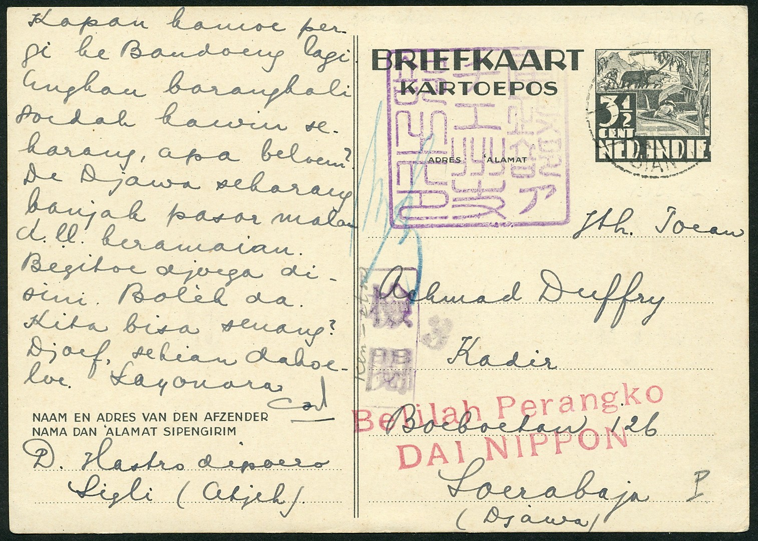 Sumatra. Atjeh. 3½ Cent postcard with square military authority cachet in violet Bu.25a written in Sigli (Atjeh) on 2602.12.1, however cancelled Pematang-/Siantar 17.12.1 (in the East Coast), sent to Soerabaja. In red propaganda cachet ´Belilah Perangko/DAI NIPPON´ (= buy Dai Nippon stamps)