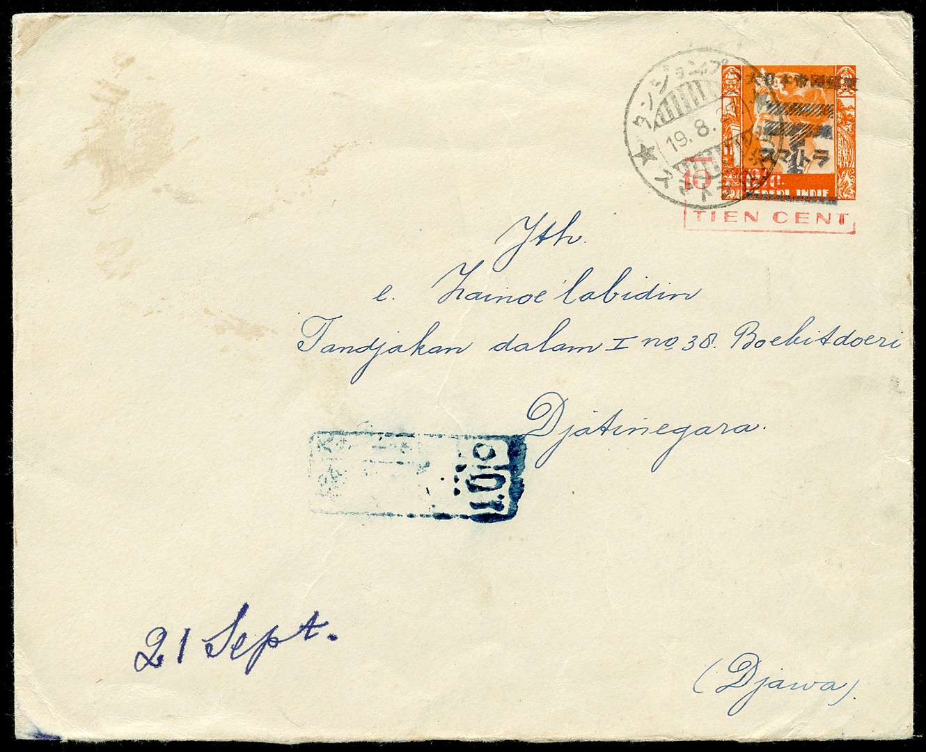 Sumatra. East Coast. 10 Cent on 12½ cent postal stationery envelope with handstamped T overprint Bu.187 from Tandjongpoera 19.8.27 to Djatinegara (Java, pre-war name Meester Cornelis), possibly received or answered on 21 Sept