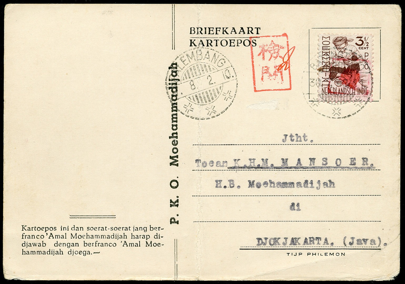 Sumatra. Tapanoeli. 3½ Cent Moehammadijah with small red Hinomaru overprint no. 211r-62 on special Moehammadijah postcard (not disturbing vertical crease), from Batangtaro 30.7.42 via Palembang 17.8.2 to Djokjakarta