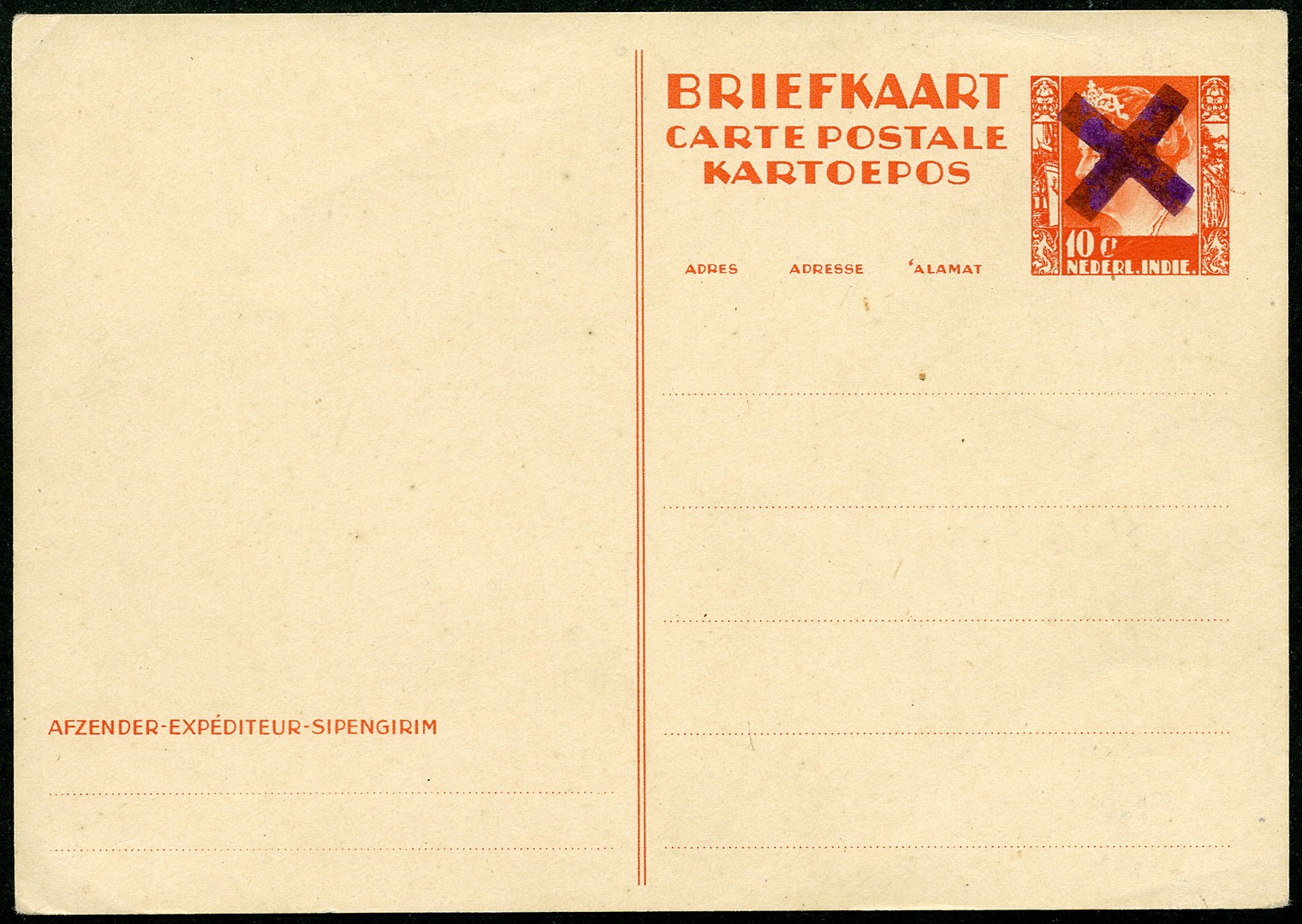 Sumatra. West Coast. 10 Cent postcard type Kreisler with violet cross overprint Bu.147, unused