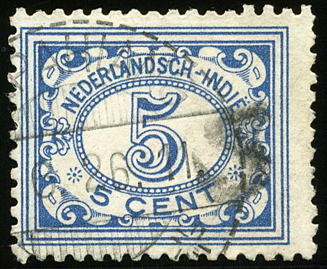 Sumatra. Benkoelen. 5 Cent Numeral with monogram overprint S of postmaster Soeleiman in black no. 381z-42, cancelled Kepahiang. Signed Boekema. Rare stamp! € 500