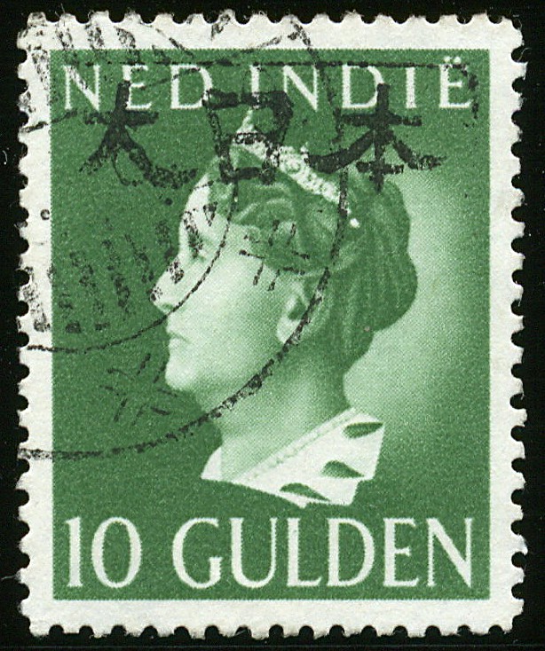 Sumatra. Benkoelen. 10 Gulden van Konijnenburg with black large overprint Dai Ni Hon in straight frame no. 841z-57, cancelled. A rare stamp in wonderful condition! € 300