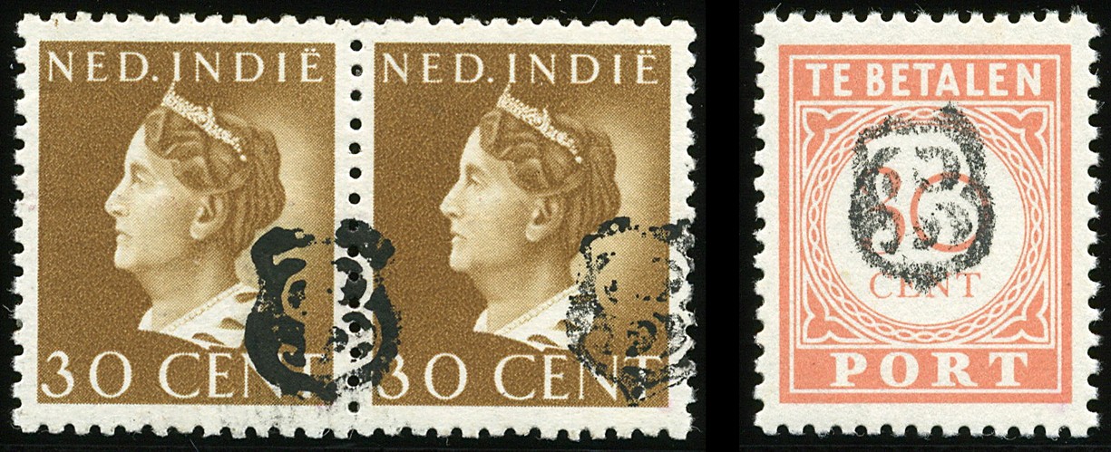Sumatra. Palembang. Signet ring overprint BST of postmaster Boestam in black, used locally in Sekajoe no. 523z on a nice selection of 16 different unused stamps (incl. 1 pair) type Van Konijnenburg and postage dues, some signed Boekema. Cat. ca. € 630