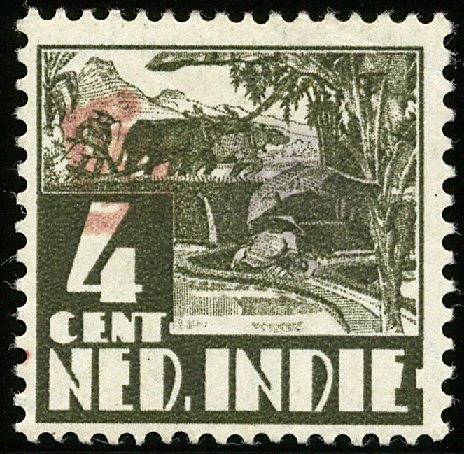 Sumatra. Palembang. Monogram overprint MSL of postmaster Mas Slamet in red in combination with IPL overprint on 4 cent Kreisler no. 531r/551v-20b, unused. Signed Boekema. Not listed. Very rare stamp!