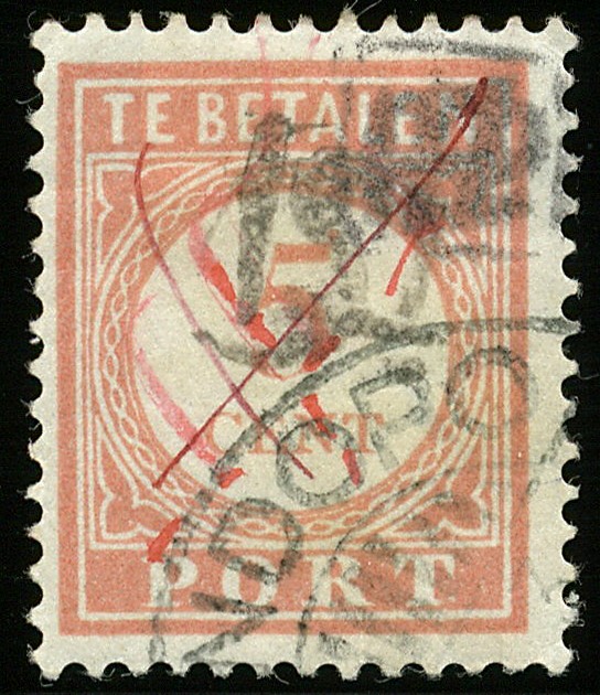Sumatra. Palembang. Monogram overprint MSL of postmaster Mas Slamet in black in combination with IPL overprint on 5 cent postage due no. 531z/571z-80a, cancelled Pendopo. The red pen cross means that the due could not be collected by the postman. Not listed. Very rare stamp!