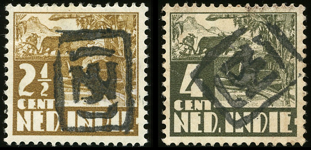 Sumatra. Palembang. Monogram overprint MN of postmaster Mohamad Noer in black, used locally in Moeara Klinggi, on 2½ and 4 cent Kreisler nos. 532z-17b and 20b, both unused. € 500