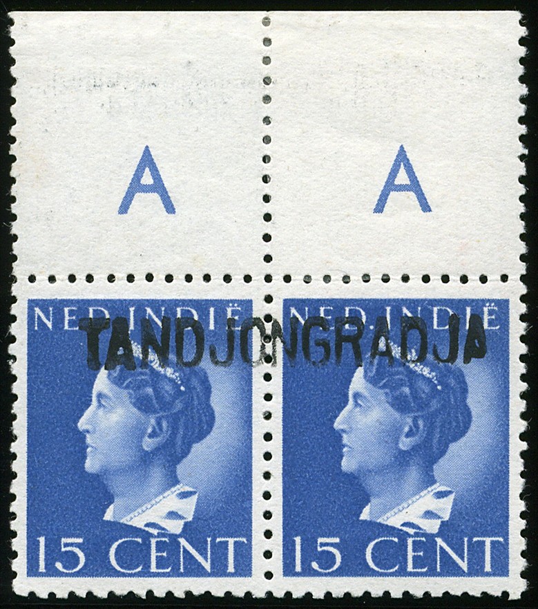Sumatra. Palembang. Place-name overprint TANDJONGRADJA covering two stamps in horizontal pair in black on 15 cent Van Konijnenburg with sheet margin no. 547z-44. € 300