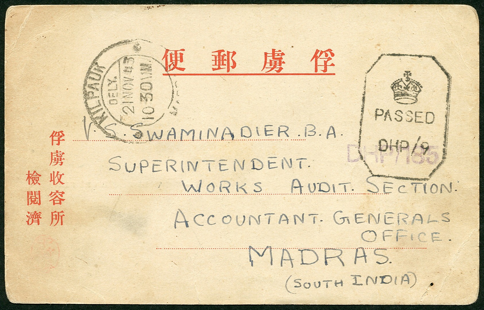 POW. Malaya. POW card (no location designation) with printed message on reverse to Kilpauk, Madras, India 21 Nov 1943 (Jacobs MA1). Very rare
