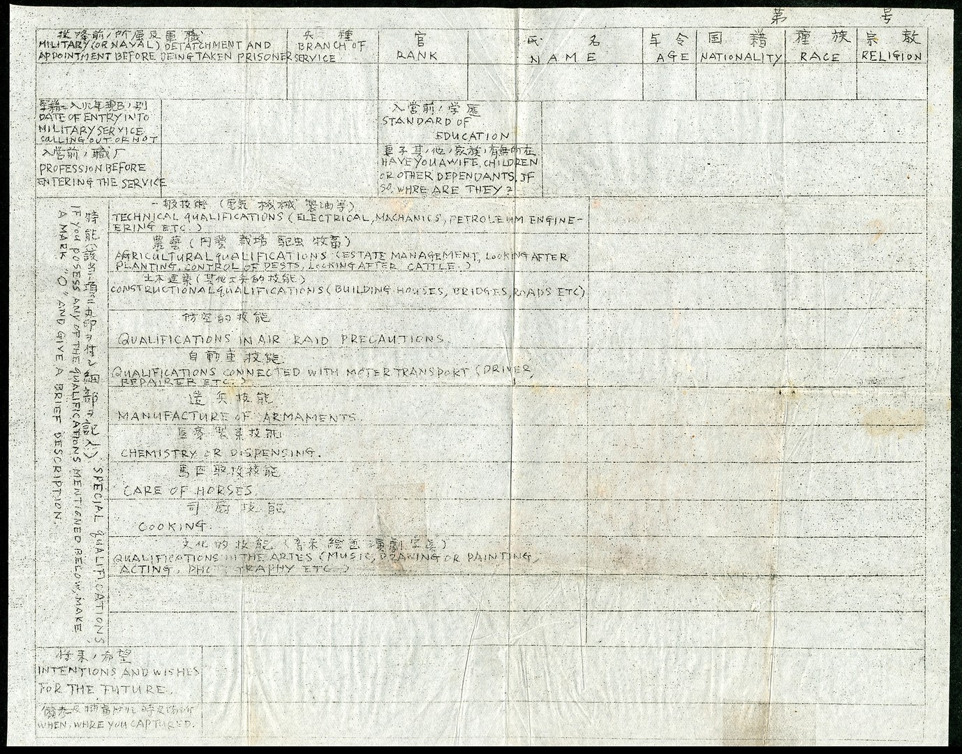 POW. Malaya. Biographical data form required of British Prisoners of War for Japanese records (Jacobs MA31). Rare document which we have not seen before