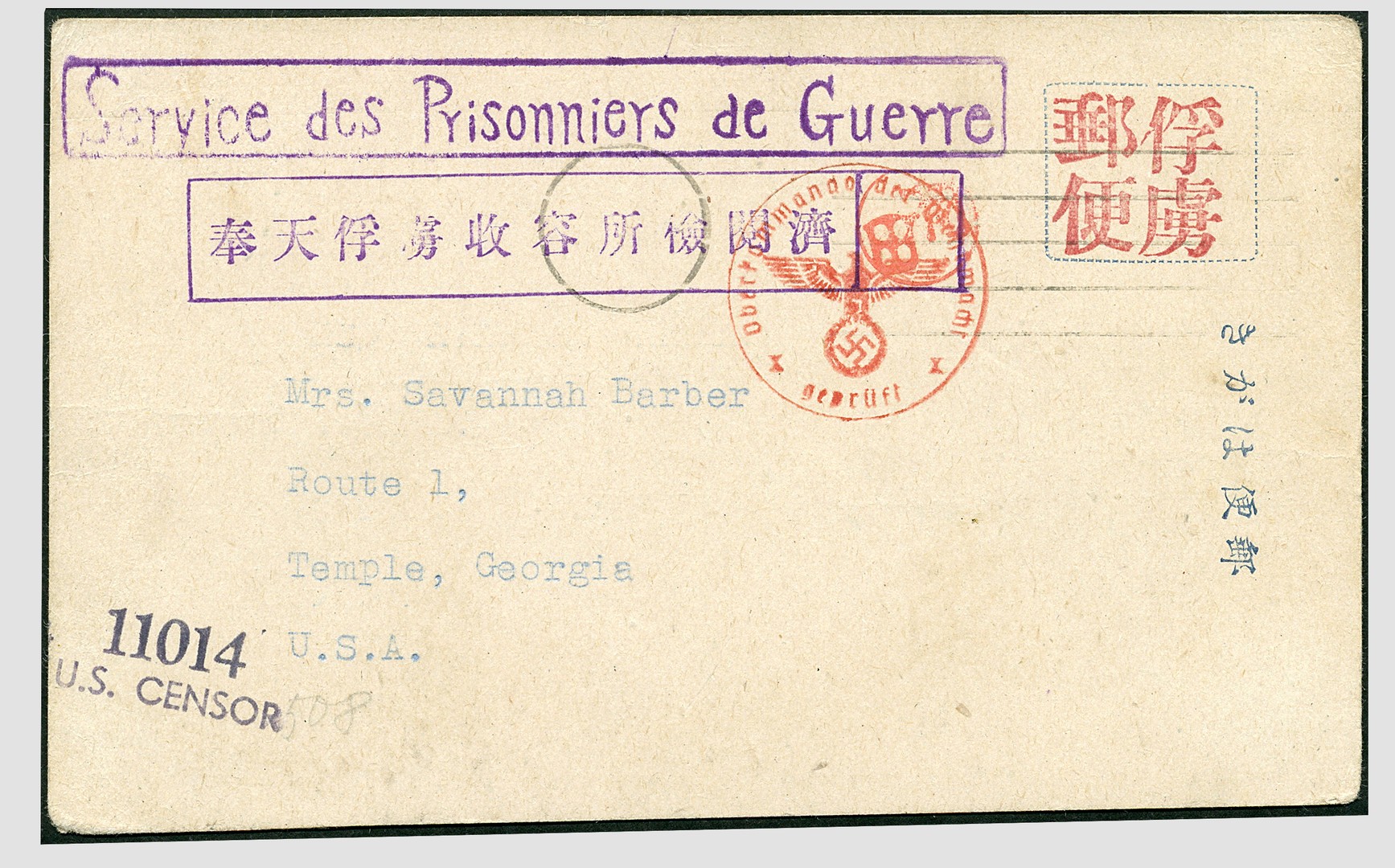 POW. Manchukuo. POW card from a son in the Hoten Camp to his parents in Temple (USA), undated but sent before the Great Pacific War, showing censors from Japan, Germany and the USA. See: Norman Jacobs, Allied and Japanese POW, p.30