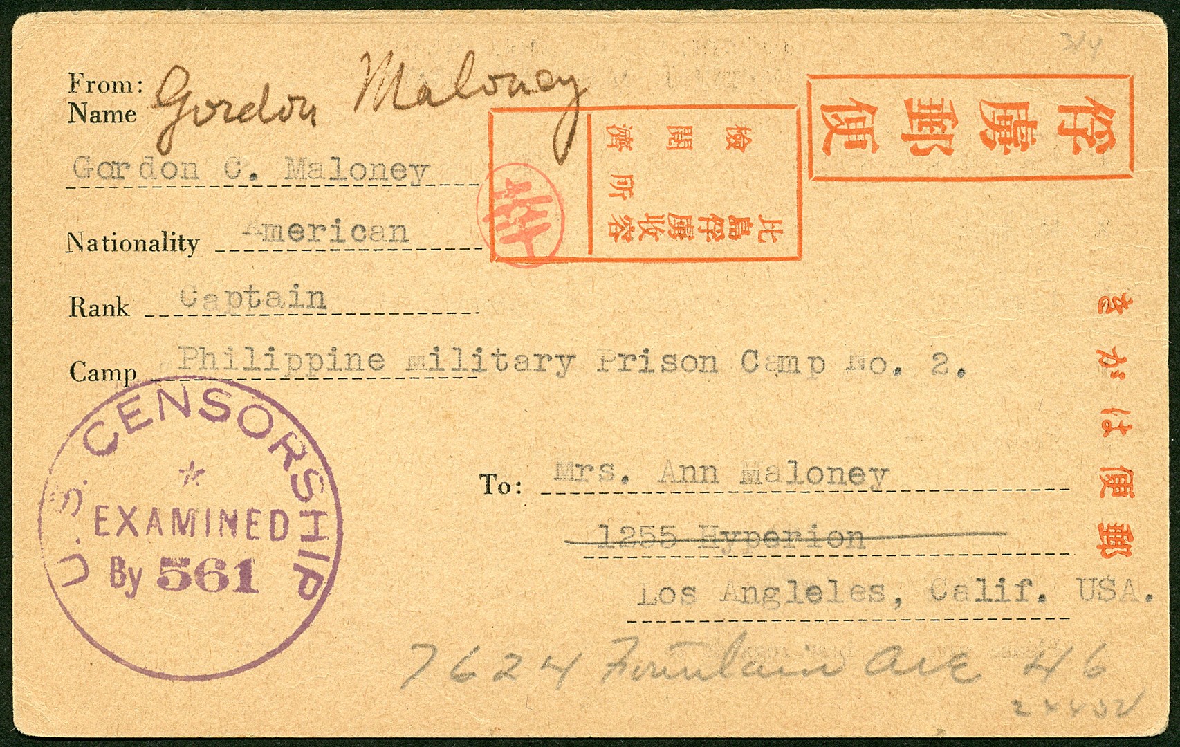 POW. Philippines. POW card from an American officer in the Military Prison Camp No. 2 with on the reverse printed sentences to make a choice, to Los Angeles showing Japanese and American censors (Jacobs P1)
