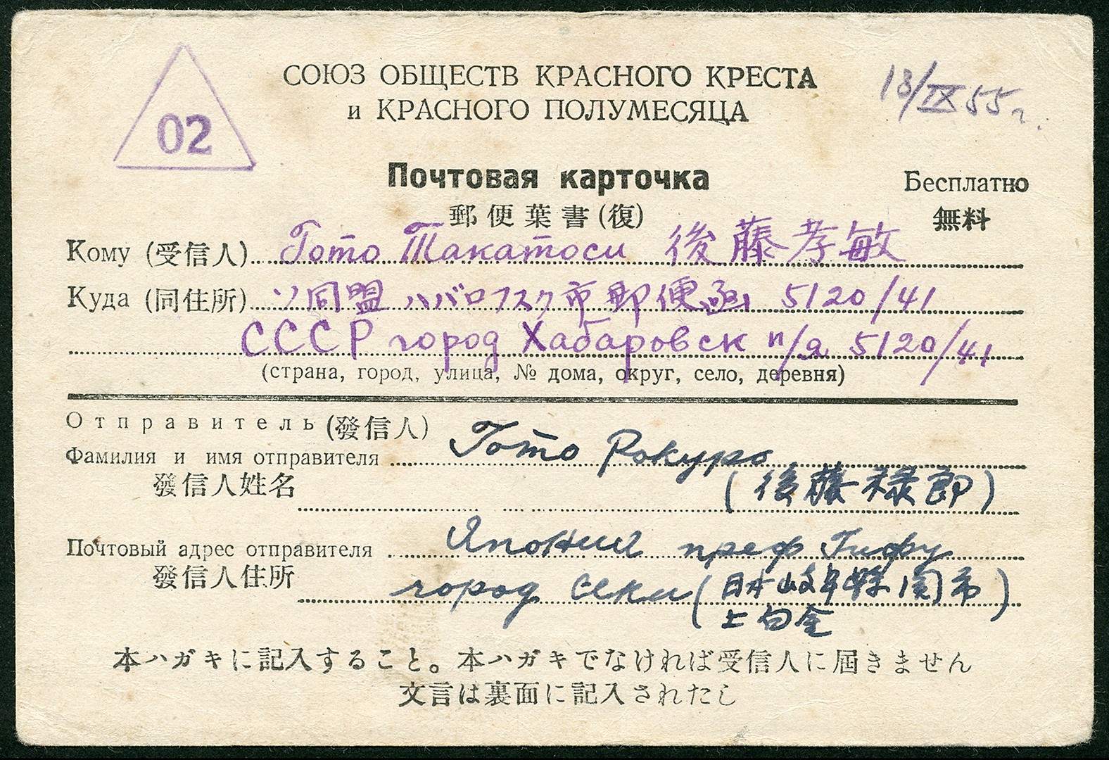 POW. Soviet Union. Postcard (reply-paid card) from Japan to a Japanese Prisoner of War in the Soviet Union. This type was used during 1945-46 (Jacobs JSO12). Rare