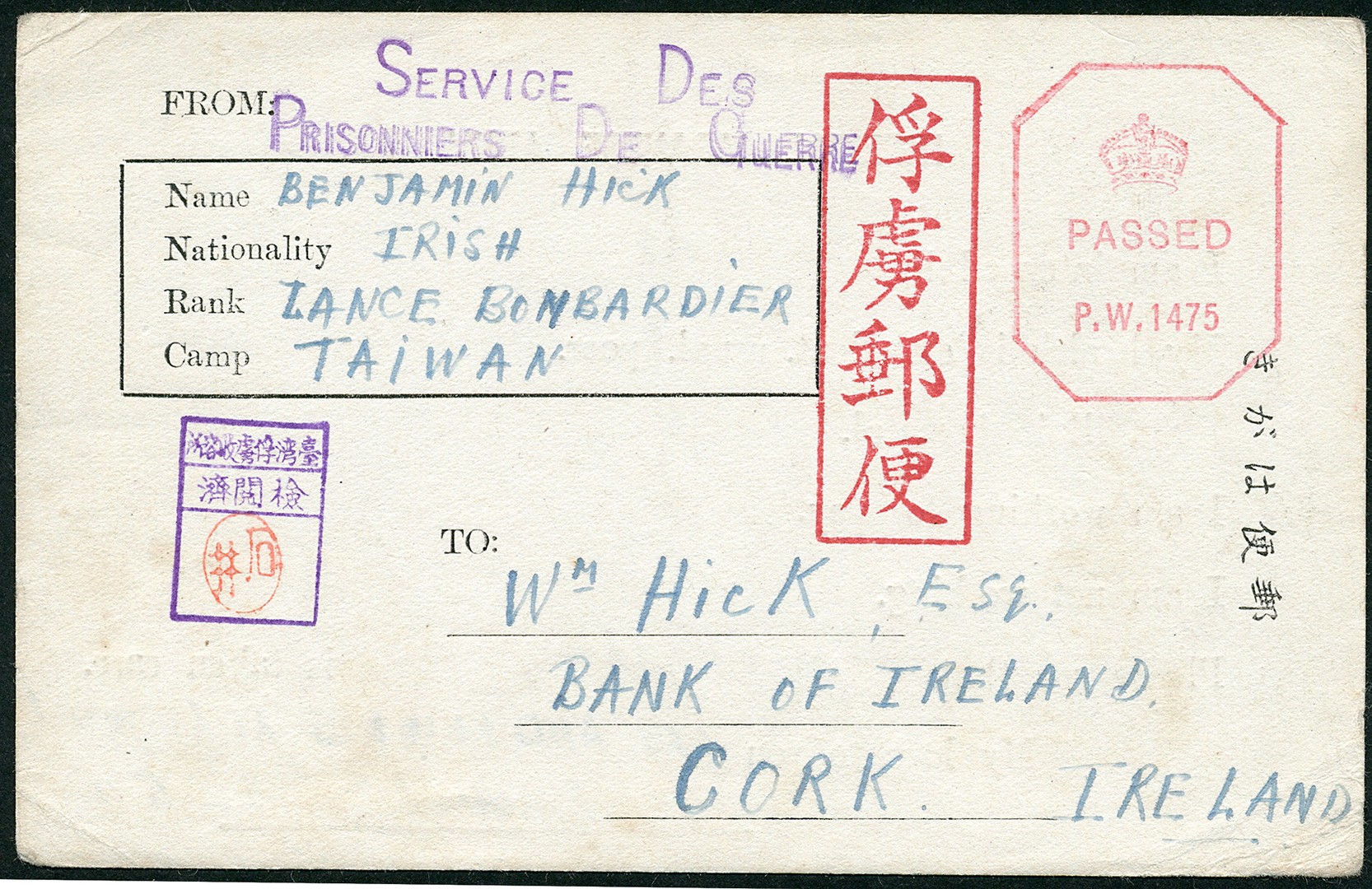 POW. Taiwan. Three different types of POW cards all with two-line framed cachet ´Service Des/Prisonniers De Guerre´, one from 25 April 1944 to Bicester in England, another type from 22 May 1943 to Cork in Ireland and a third one from 20 Feb 1943 to Nebraska in the USA, all showing Japanese and/or British censor marks (Jacobs TA1, TA4 respectively TA2)
