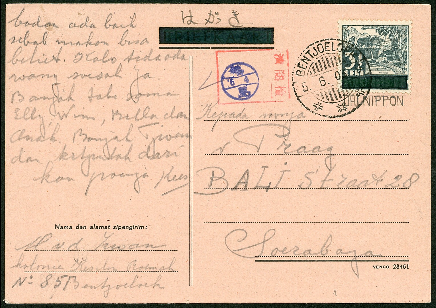 POW. Netherlands Indies. Java. Postcard bearing 3½ cent Kreisler with deletion of country name and written Dai Nippon, from the Kesilir Colony via Bentjoeloek 5.6.03 to Soerabaja