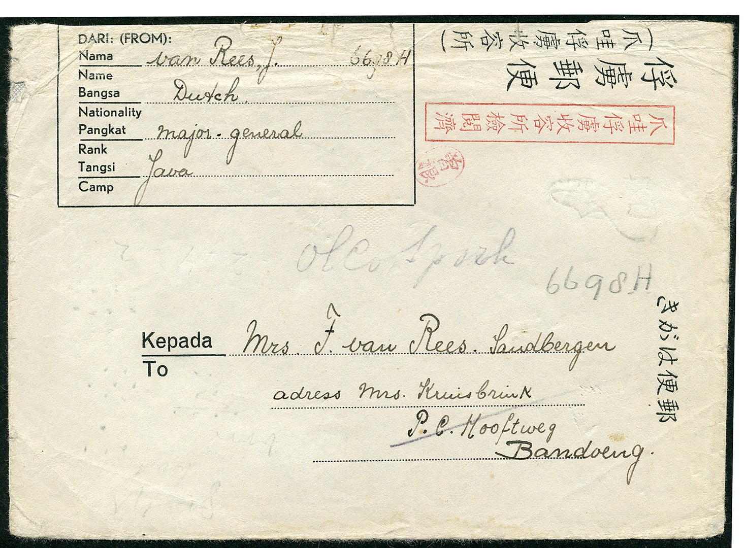 POW. Netherlands Indies. Java. POW envelope Bu.PW2 (repaired) from Major General van Rees to his wife in Bandoeng, received 25 Jan 1943. This POW envelopes were only for high ranking officers. General BDJ van Rees was old-inspector of Military Medicine Service of the KNIL. Extremely rare, only two recorded