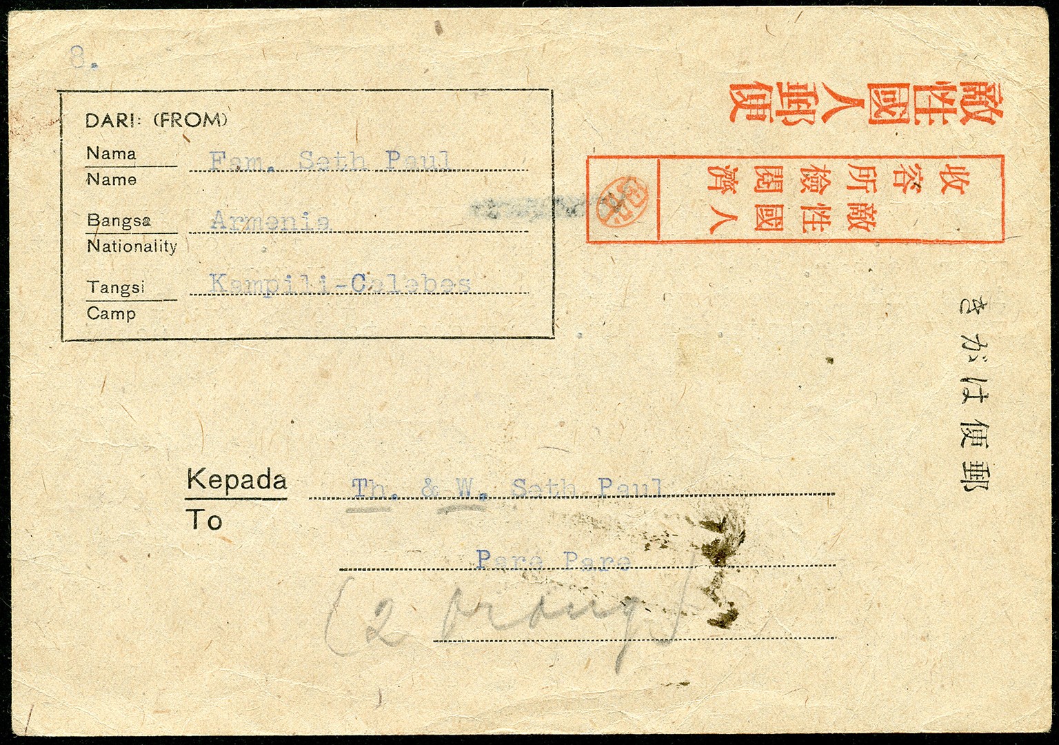 POW. Netherlands Indies. Celebes. POW card Bu.PW9 from the Kampili Camp written on 13 May 1945 to family in Pare Pare, received in the Bolong Camp (Toradja region) on 24 July 1945