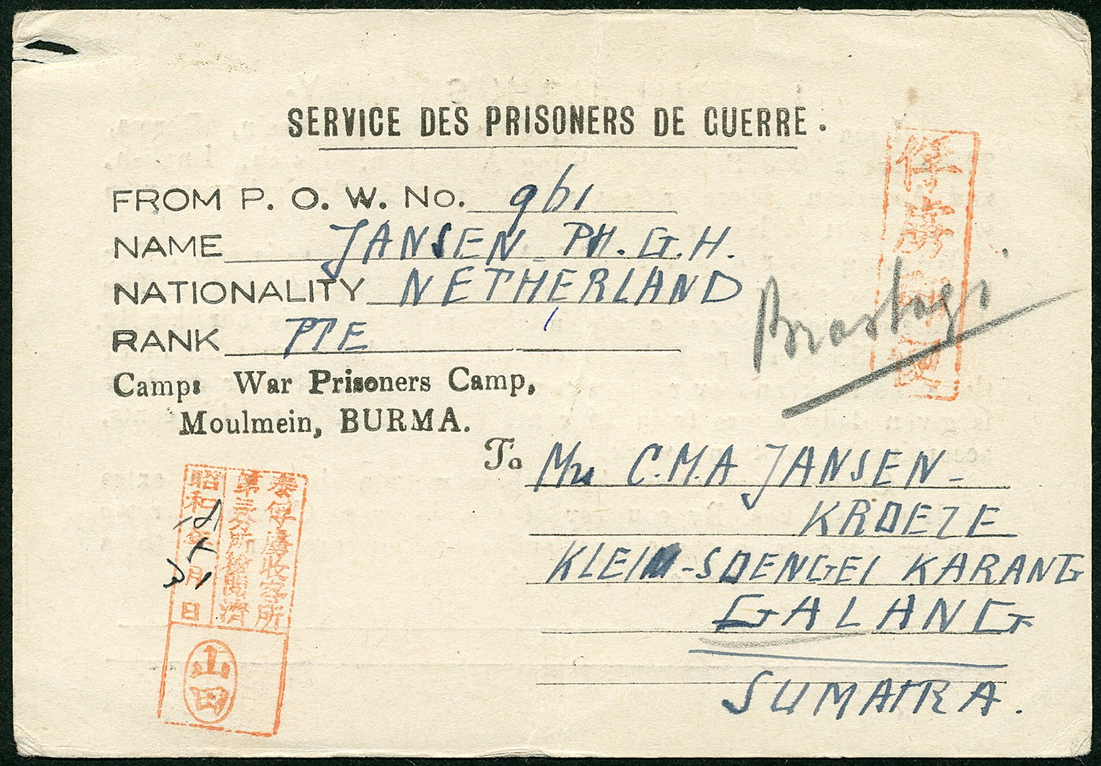 POW. Netherlands Indies. Burma. POW card Bu.PW22 from a camp in Moulmein, with on the reverse only a printed text with signature of the sender, to Galang in Sumatra´s East Coast, redirected to Brastagi. Extremely rare POW card (Bu.RRR)