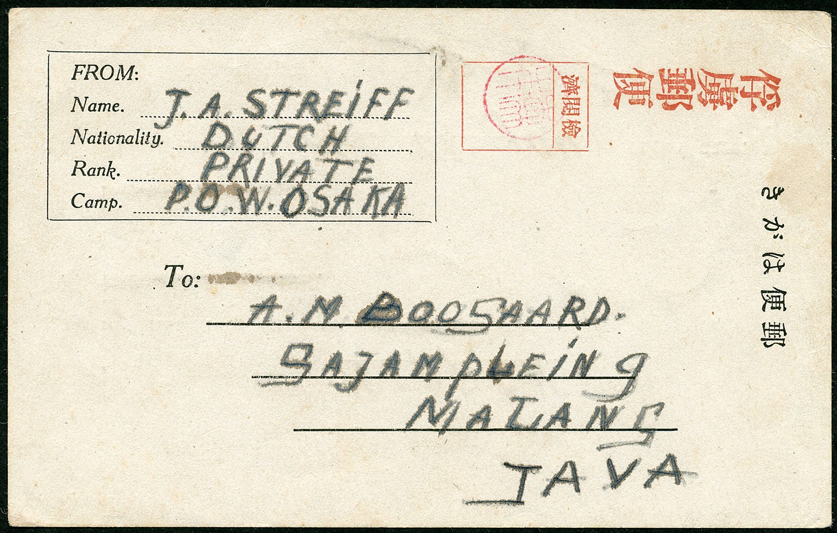 POW. Netherlands Indies. Japan. POW card Bu.PW27a from a camp in Osaka to Malang, Java