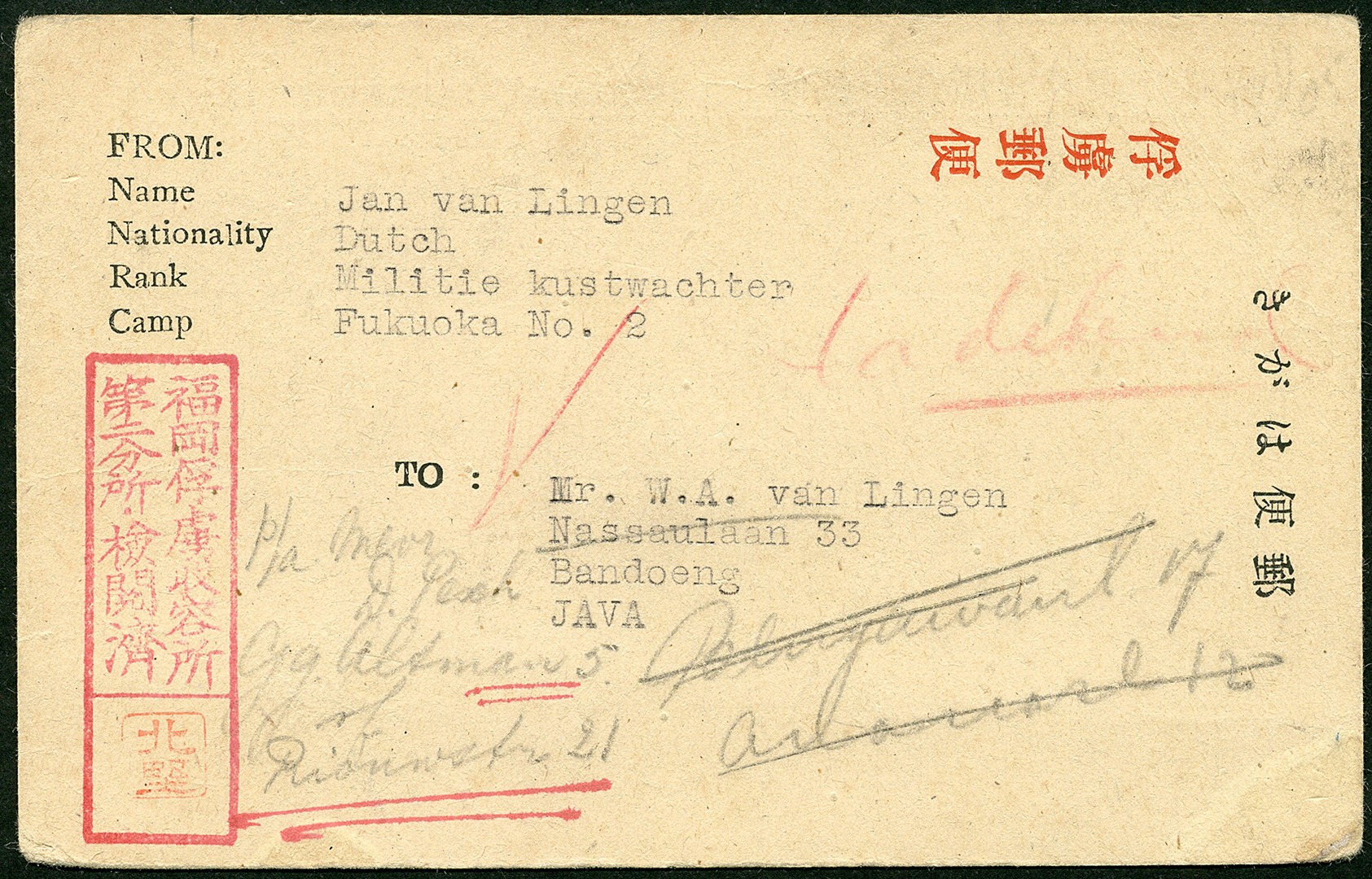 POW. Netherlands Indies. Japan. POW card Bu.PW26 from Fukuoka Camp No. 2 in the harbour of Nagasaki, Japan, to Bandoeng, several times redirected within the city. Ex Hiegentlich