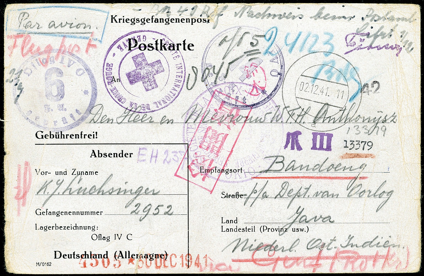 POW. Netherlands Indies. Germany. Illustrated POW card from an internee in Germany with text (in Dutch) ´With our best wishes for Christmas and 1942´ on 30 Dec 1941 via the International Red Cross in Geneva to Bandoeng, showing German and Japanese censors. Very interesting postal history item!