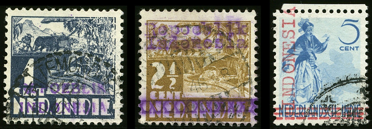 Republik. Java. Typewritten two-line violet overprint Repoeblik/Indonesia on 1 and 2½ cent Kreisler, cancelled Temondjokja (RR) resp. Cirebon, and red vertical overprint INDONESIA on 5 cent Dancer, cancelled. Rare stamps!