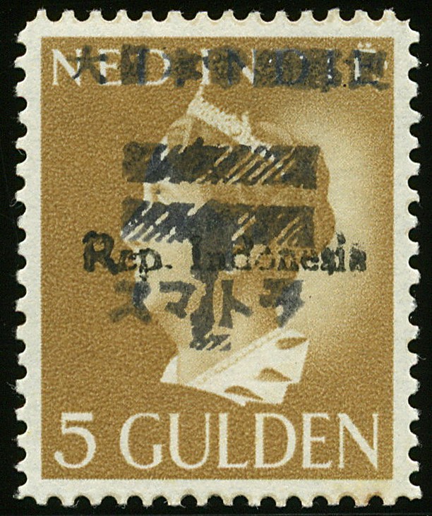 Republik. North Sumatra. Handstamped overprint Rep. Indonesia (17 mm) type 211 in black on 5 gulden Van Konijnenburg no. 56 with handstamped T-overprint, unused