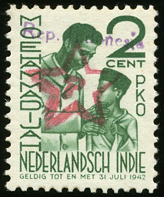 Republik. North Sumatra. Handstamped overprint Rep. Indonesia (17 mm) type 211 in violet on 2 cent Moehammadijah no. 61 with red Atjeh star overprint type 121, unused