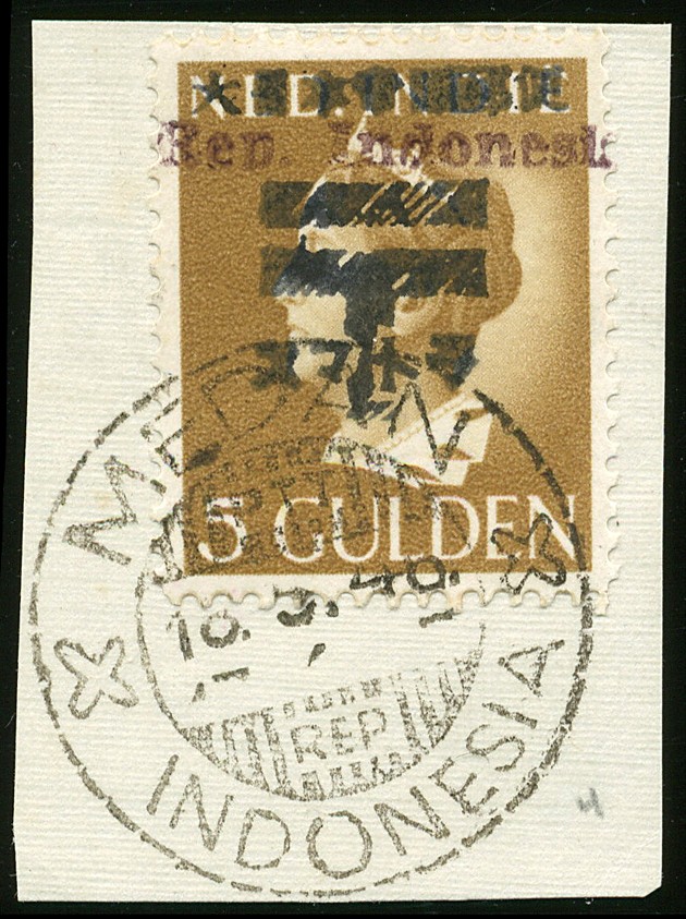 Republik. North Sumatra. Handstamped overprint Rep. Indonesia (24 mm) type 213 in violet on 5 gulden Van Konijnenburg no. 56 with handstamped T-overprint, on piece c.t.o. Medan. A rare stamp!