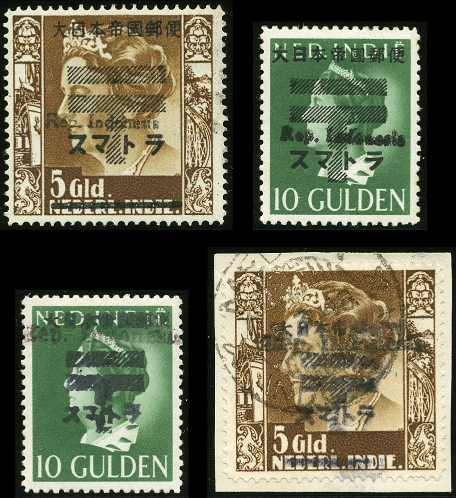 Republik. North Sumatra. Collection of handstamped overprints Rep. Indonesia of 17 mm (type 211), 19 mm (type 212), 24 mm (type 213), in italics of 23 mm (type 214) and Repoeblik Indonesia of 33 mm (type 215) in different colours, on a wide array of ca. 505 stamps with or without 1 or 2 overprints from the Japanese occupation, mostly unused, some c.t.o. Medan. Interesting lot for the specialist!