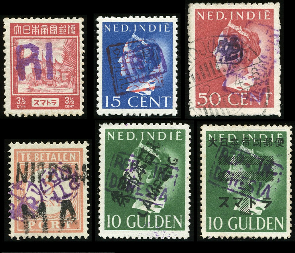 Republik. Sumatra. Palembang. Selection of stamps with handstamped overprint RI (type 51) in violet on 13 different unused stamps, handstamped overprint RI in frame (type 52) in black or violet on 28 different unused and a few used stamps, two-line handstamped overprint REP./INDONESIA in frame (type 53) in black or violet on 8 different unused or used stamps, two-line handstamped overprint REP. IN-/DONESIA in frame (type 54) in black or violet on 96 different unused or used stamps, and handstamped overprint PTT/NRI in circle (type 55) in violet on 17 different unused stamps