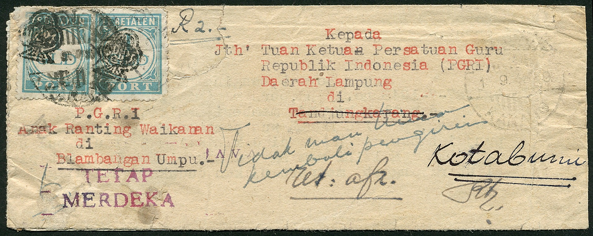 Republik. Sumatra. Two copies of 1 gulden postage due domestic printing with black overprint PTT URIPS in cloverleaf design no. 73z-12b on cover, cancelled Tandjong-/Karang 1.9.48 to Kotaboemi, in Nov 48 (!) returned to sender because the addressee refused to receive the letter (´Tidak mau terima/kembali pengirim´), on the back a piece of paper (note) attached. These stamps, used locally in Tandjong Karang, are very rare on cover