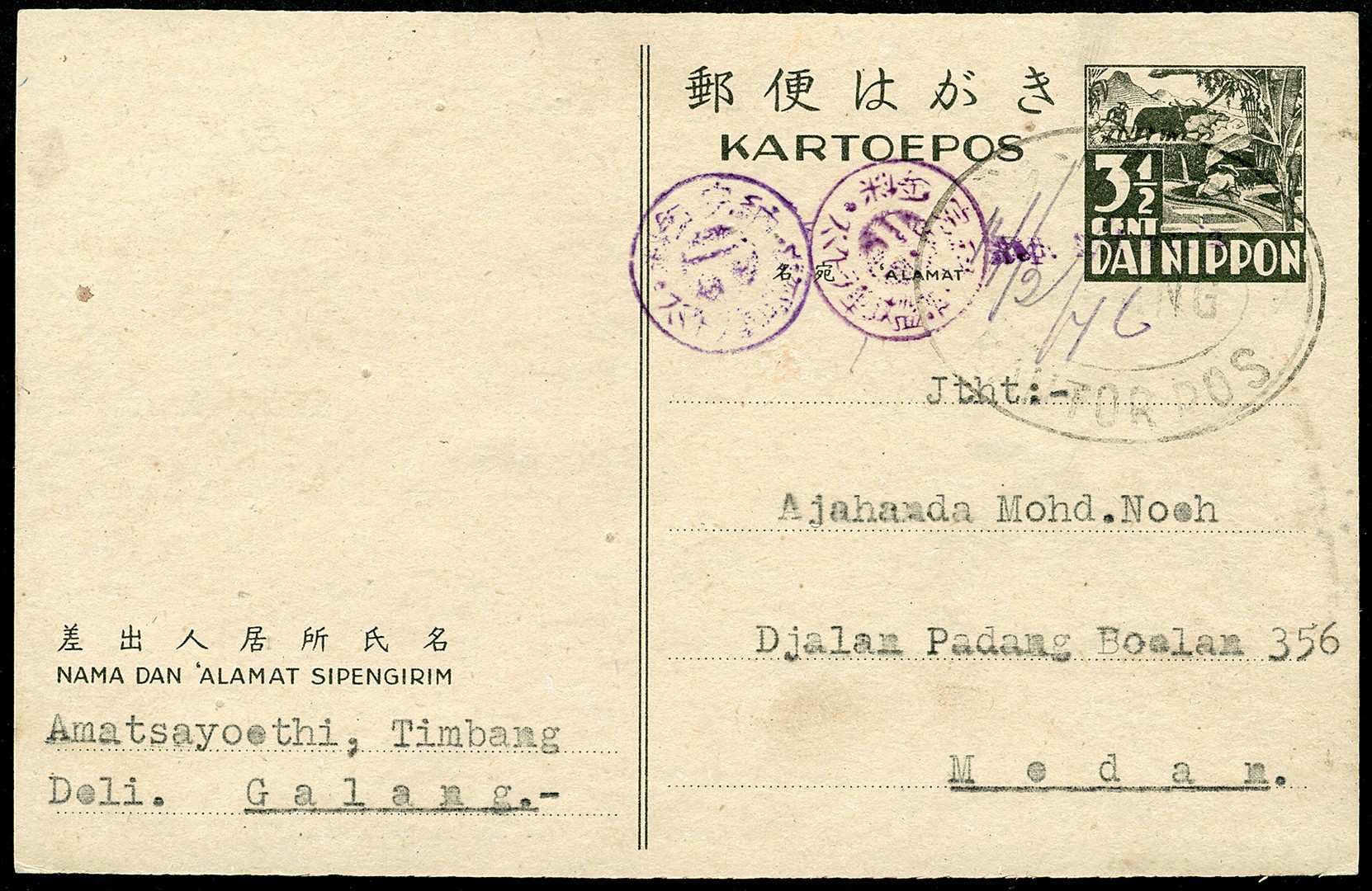 Republik. Sumatra. 3½ Cent postcard with violet Rep. Indonesia overprint type 213v and two revaluation marks in violet Bu.RS9c, from Galang with written date 11/2 46 to Medan. Light strike of the very rare oval negative postmark GALANG (type 090)