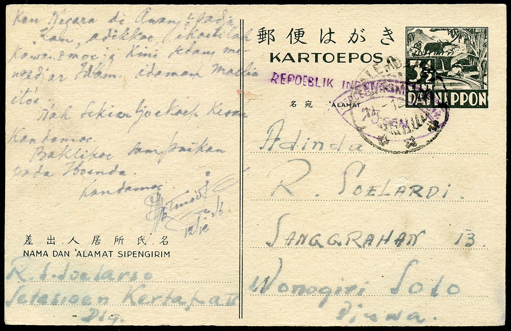 Republik. Sumatra. 3½ Cent postcard with violet Repoeblik Indonesia overprint and with violet oval revaluation mark Repoeblik Indonesia 75 sen Bu.43, from Palembang 11.-12.46 to Wonogiri (Java)