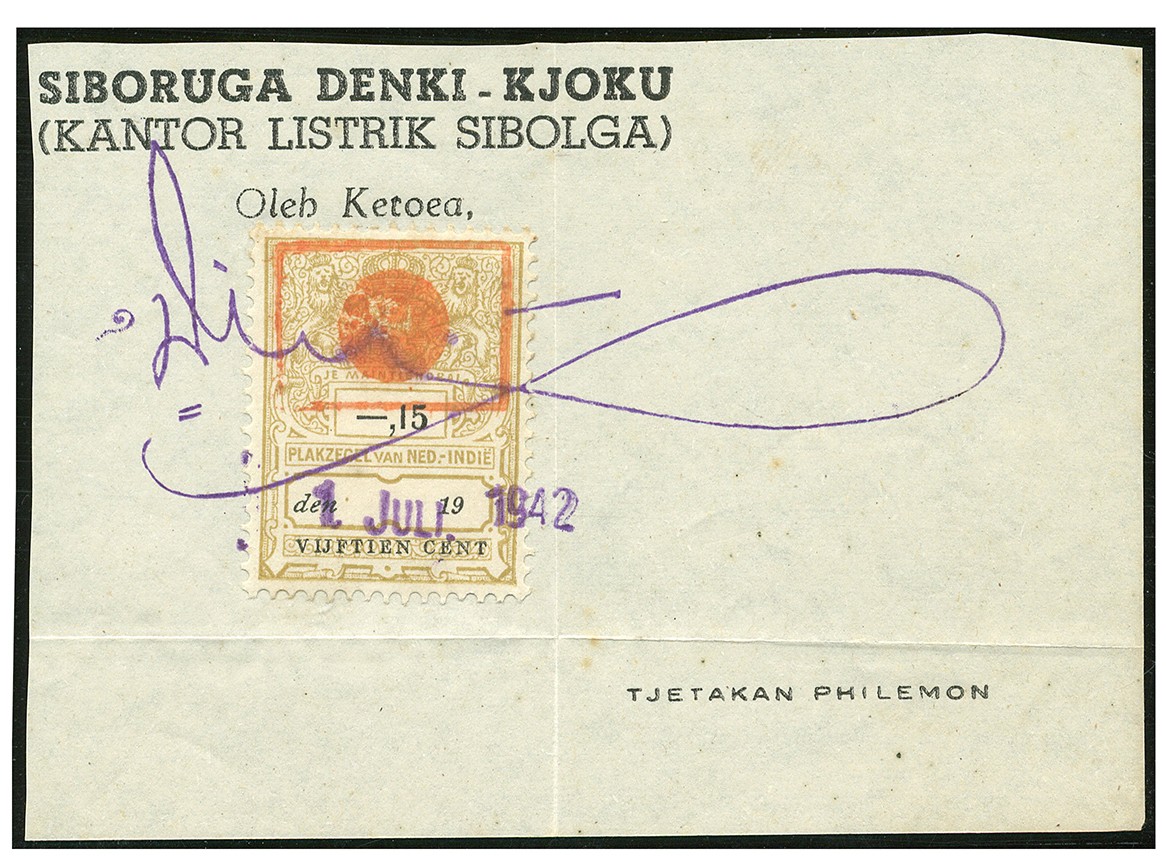 Revenues. Sumatra. Tapanoeli. -,15 with red Hinomaru overprint no. JSP-10 on document from Sibolga 1 July 1942. Scarce!