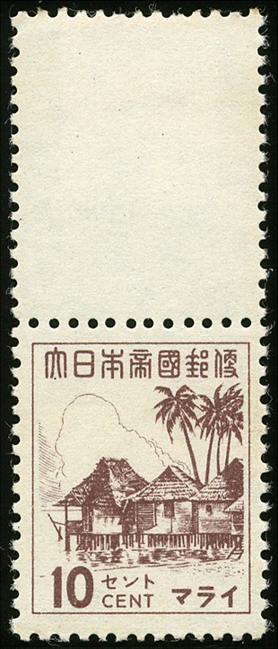 Malaya. Definitive issue. Combined colour proofs of several values, printed by Kolff & Co. in Batavia. From this series the 10c brown with unprinted stamp above. Not in Bessels (Kolff book, 2011, p.371). Extremely rare