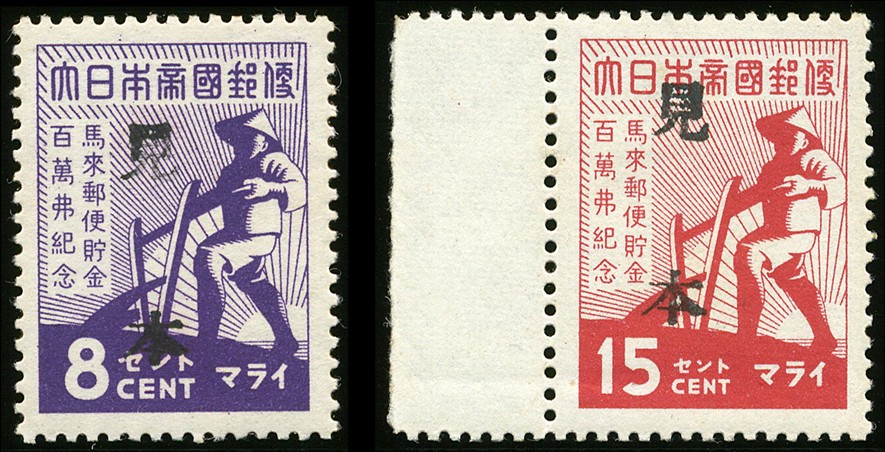 Malaya. Propaganda stamps for the Postal Savings Bank. Unmounted mint set with black Mihon (= Specimen) overprint in kanji. See: Bessels (Kolff book, 2011), p. 382