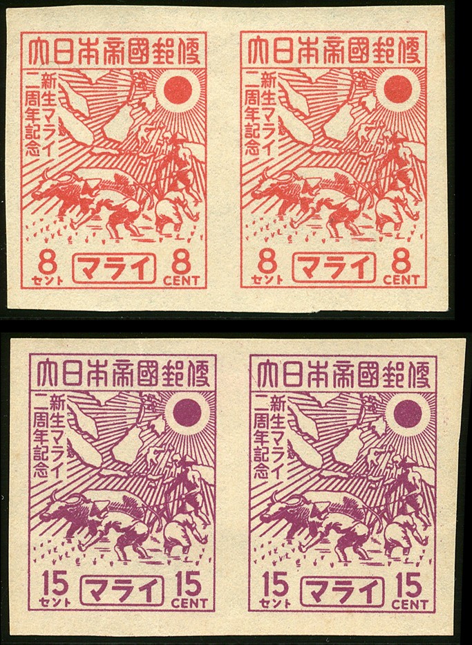 Malaya. Second Anniversary of the Re-birth of Malaya. Imperforated colour proofs, without gum, in pairs. See: Bessels (Kolff book, 2011), p.384
