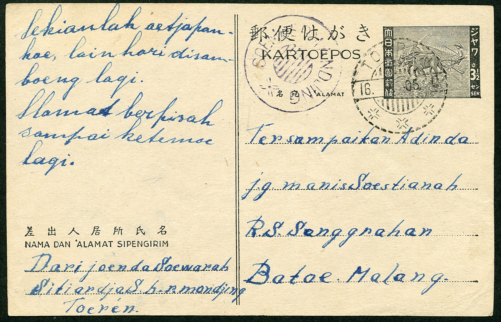 Java. SOEMBERMANDJING delivery house pmk in blue 3½s postcard Bu.6 via Toeren 16.7.05. A wonderful strike in superb quality (vNV.071, RR)