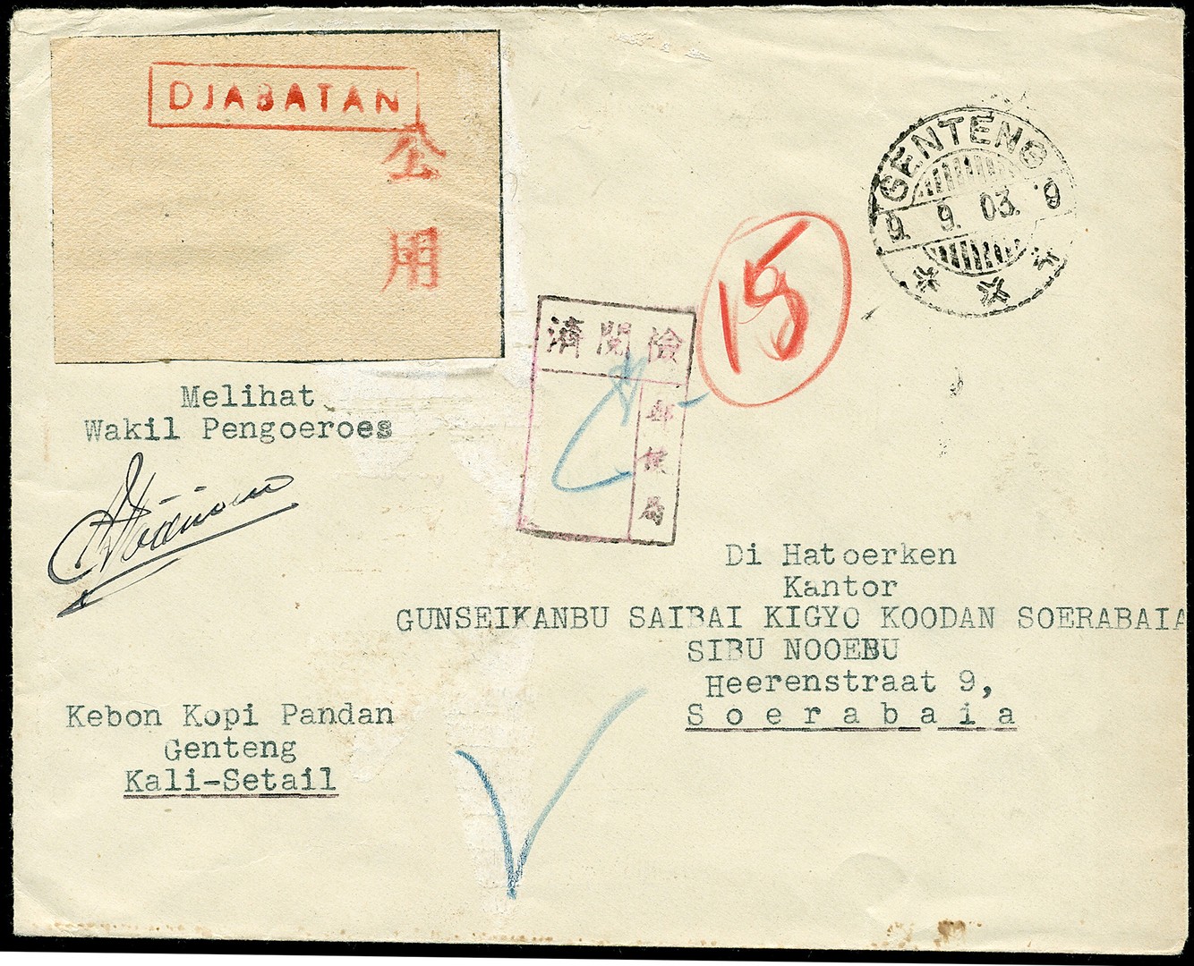 Java. Official postage free cover from a coffee plantation near the little sub-post office Genteng on 9.9.03 to Soerabaja