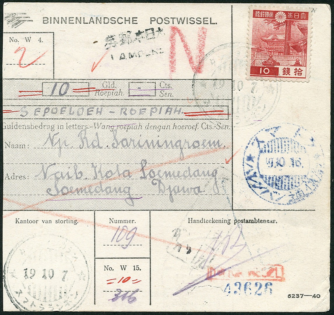 Sumatra. Lampong. 10 Sen Japanese stamp no. J10 on M.O. showing black Lampong overprint 610 from Tandjongkarang 19.10.7 via the trans communication office of Palembang 19.10.16 (type 502) to Soemedang 11.11.04 on Java