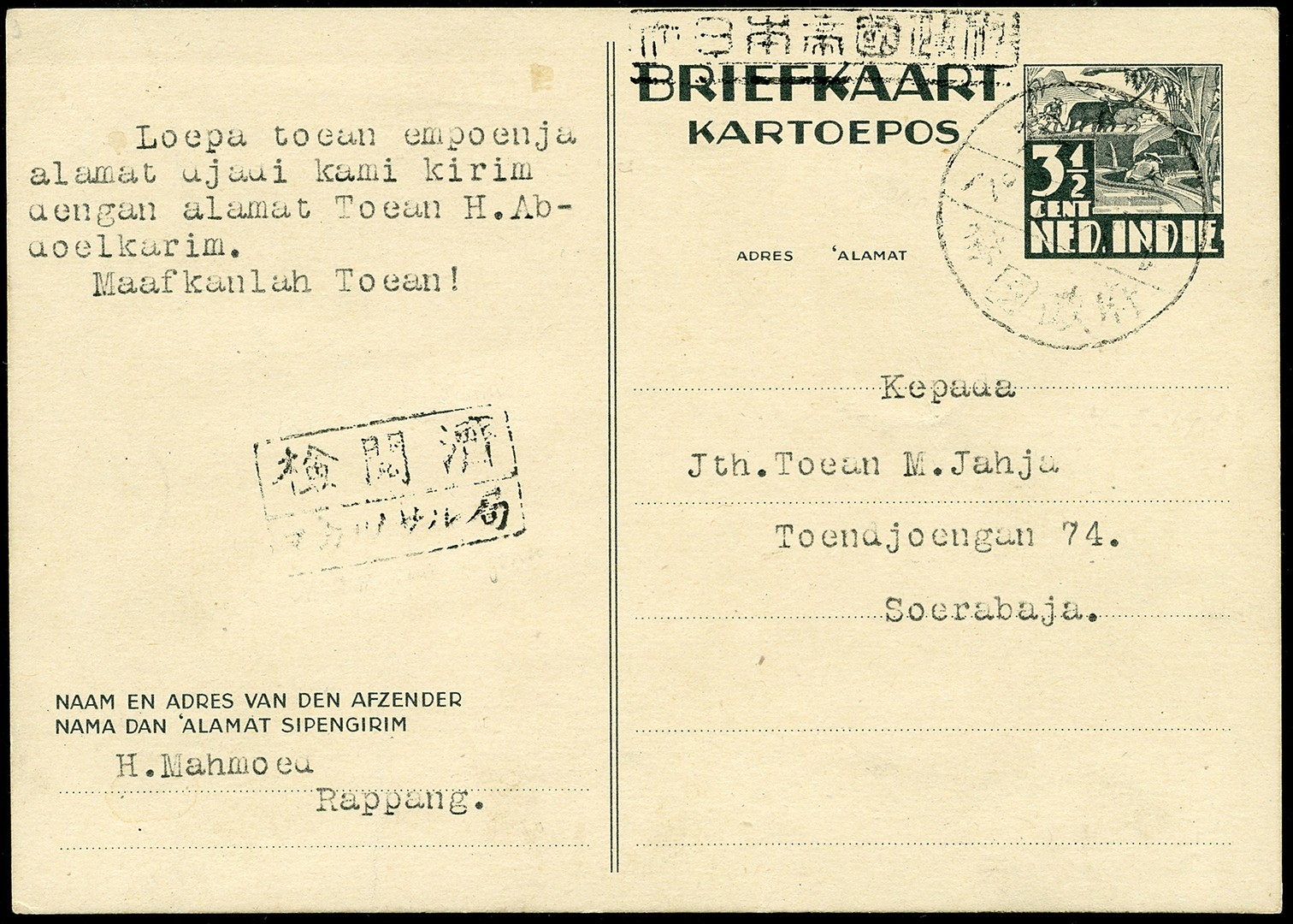 South Celebes. 3½ Cent postcard without anchor Bu.236c written at ´Rappang 4/5 2603´, though cancelled Pare Pare (vNV.300), to Soerabaja. Censor Bu.JC3a from Makasser