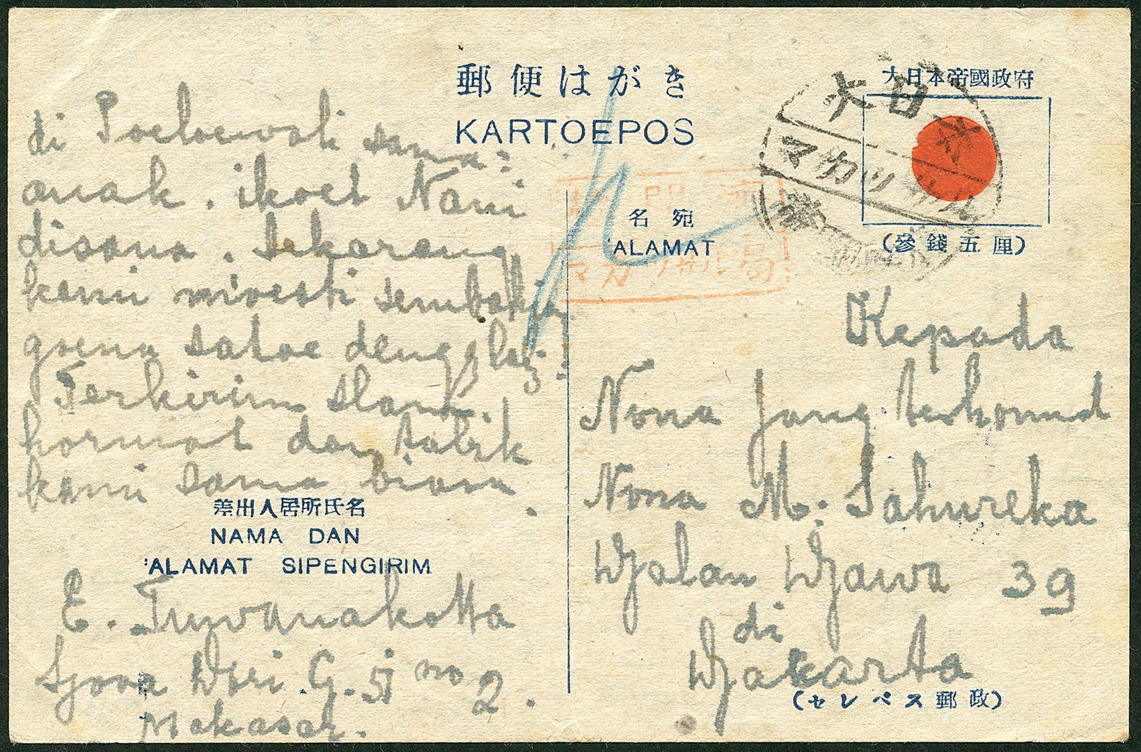 South Celebes. Hinomaru postcard of 3½ sen Bu.256 (writer responds on received letter from 17/1 04) from Makasser (type 300) to Djakarta