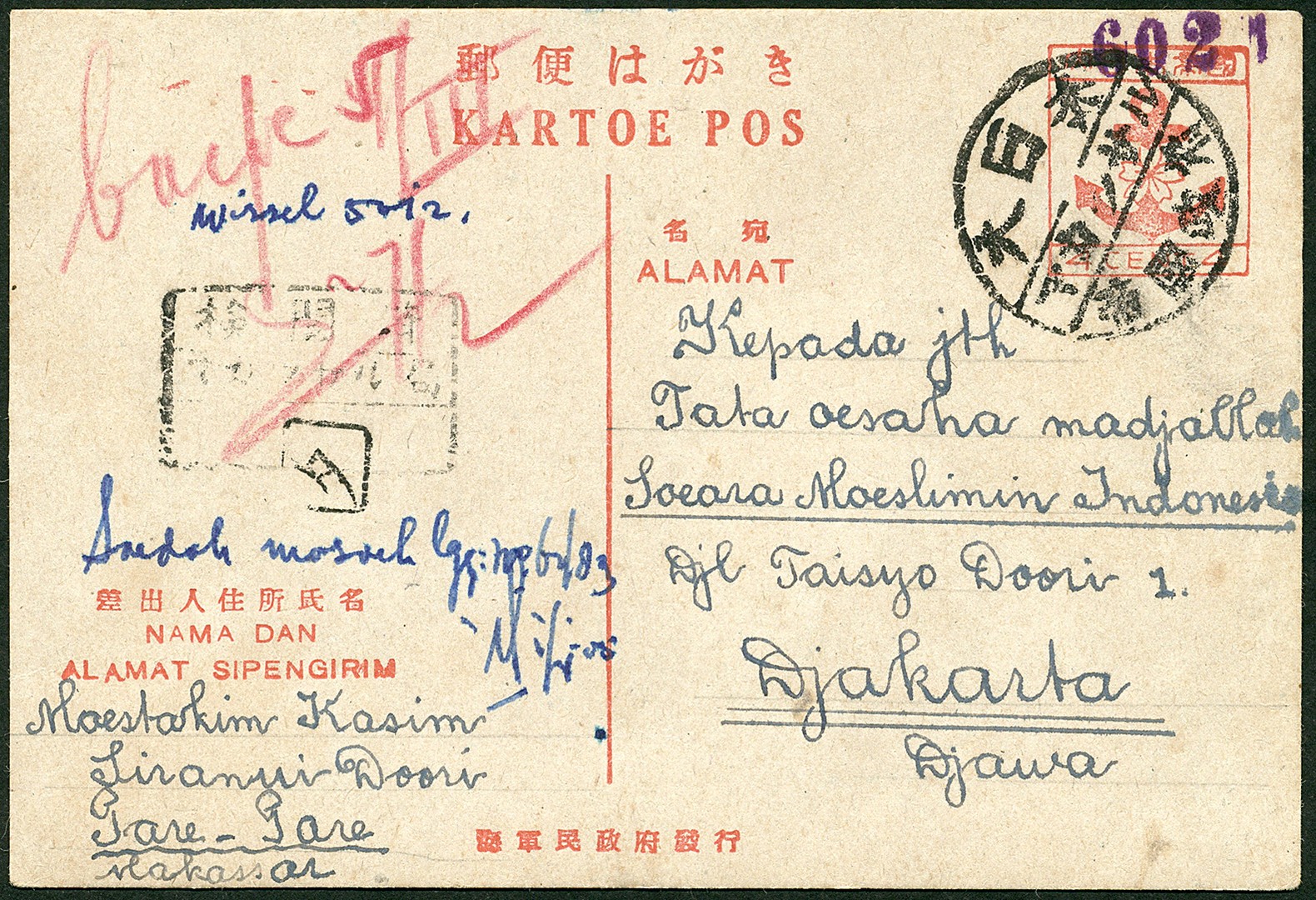 South Celebes. Anchor and Cherry Blossom postcard of 4 cent made of thick greyish paper Bu.283b from Pare Pare (type 300) to Djakarta. Censor Vr.316a from Makasser