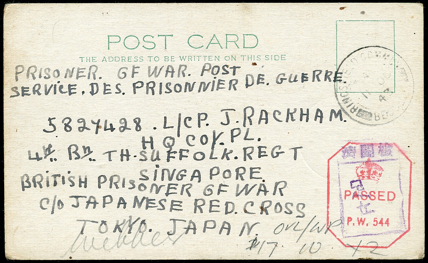 POW. Postcard from Ringsfield (UK) 11 Oct 1943 postage free to a British POW in Singapore via the Japanese Red Cross, showing British and Japanese censors