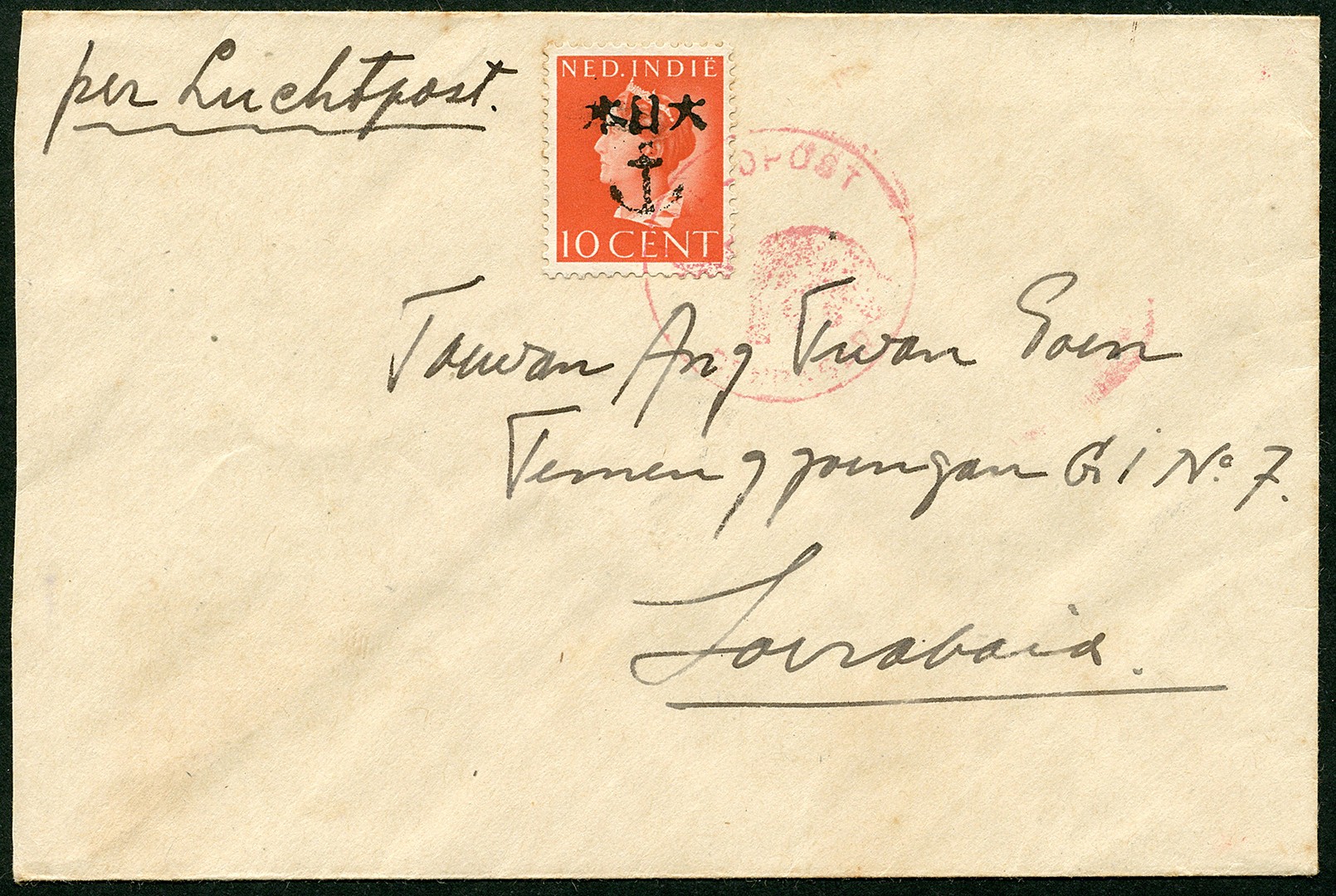 Post-occupation Curiosities. Netherlands Indies. Lesser Soenda Islands. Bali. 10 Cent van Konijnenburg with black Bali anchor overprint no. 532z-43bg used on cover, sent by the Dutch Gadja Merah (= Red Elephant Brigade) to Soerabaja 20 May 1946. Most unusual, genuine but probably philatelic